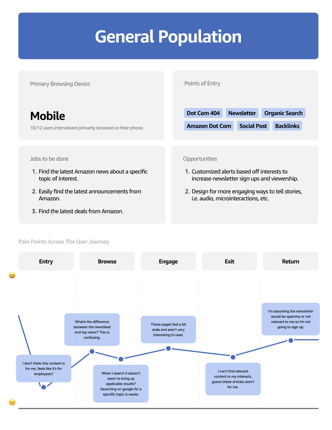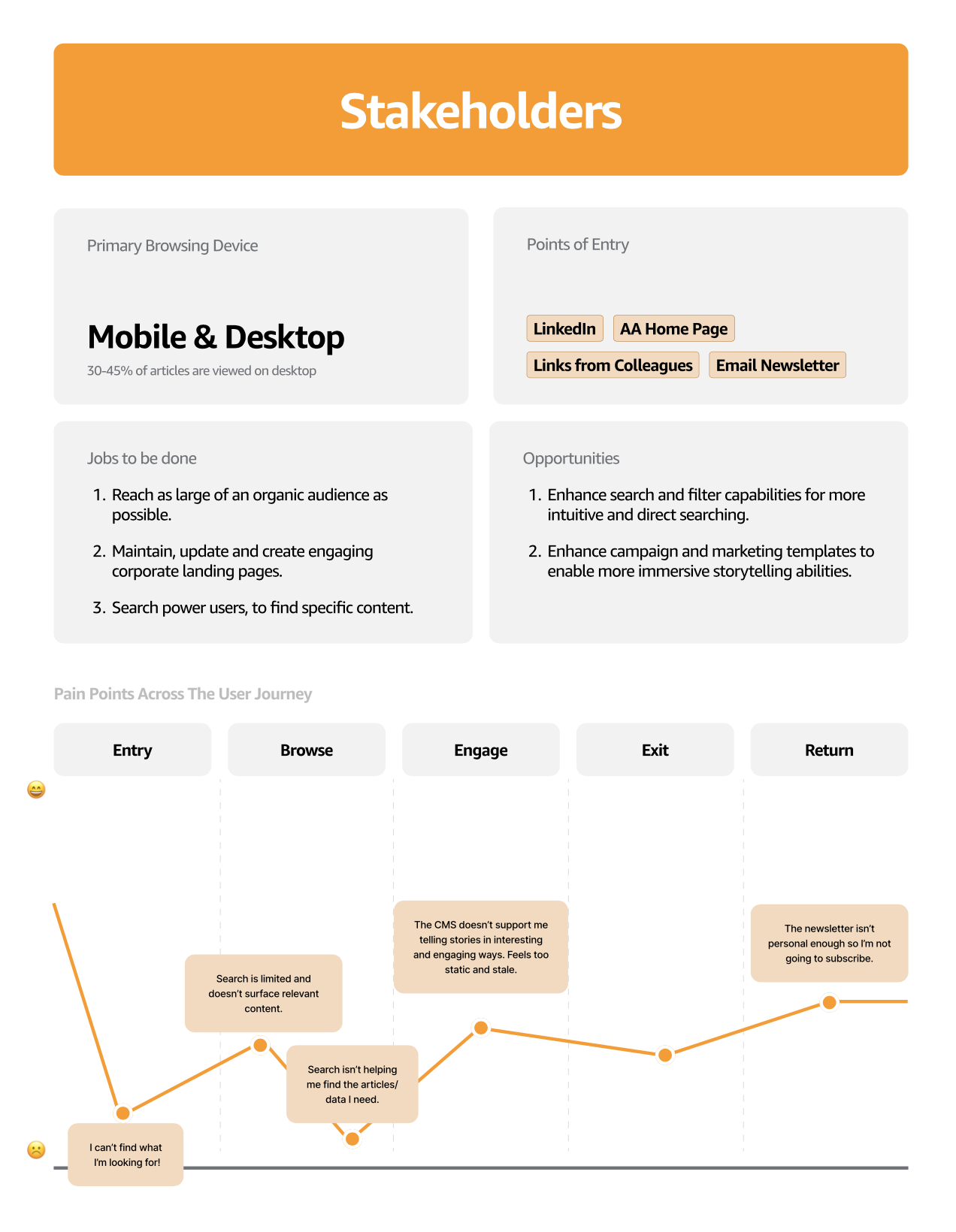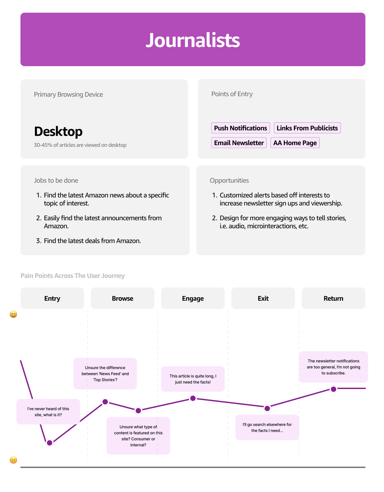 Process: I spent time in discovery, looking through data in Adobe Analytics to see the most popular news categories and user journeys. I investigated where different types of users dropped offsite, which screen sizes they used, and conducted UX tests to learn additional user pain points.