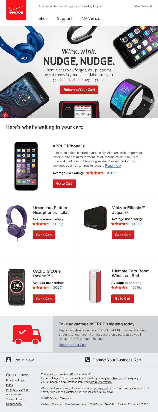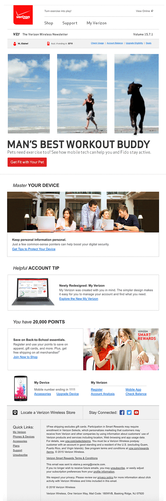Highlights: In 2015, I took on the challenge of increasing their engagement metrics by proposing a 3D animated hero image, using a cinemagraph of a dog running with it’s owner. It became the top opened and clicked email for Verizon in 2015. Another campaign of note, The "Wink Wink, Nudge Nudge" trigger email I designed won a W3 Design Award in the Telecommunications category the same year.